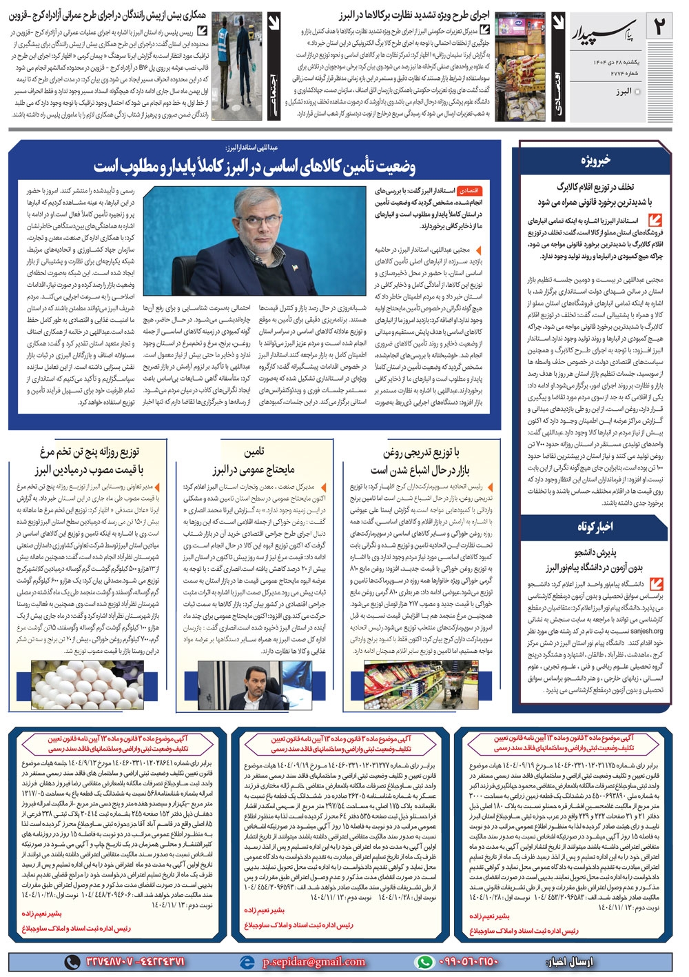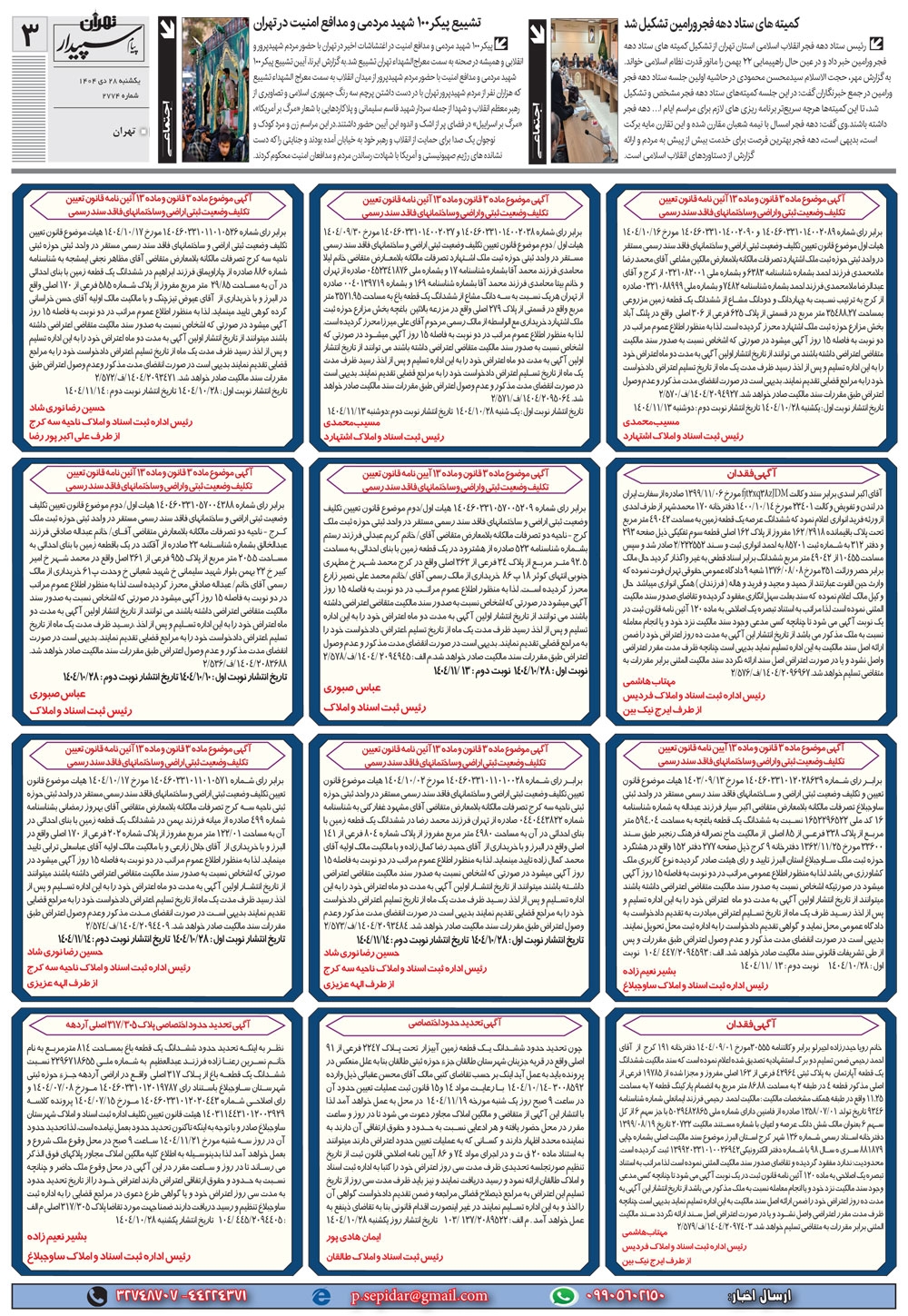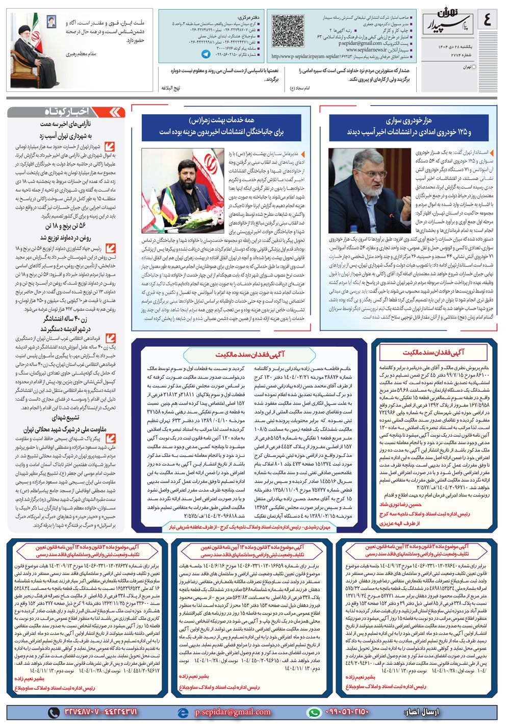 روزنامه پیام سپیدار شماره 2774 یکشنبه بیست و هشتم دیماه سال هزارو چهارصدو چهار منتشر شد و در دسترس مخاطبین قرار گرفت. روزنامه پیام سپیدار را می توانید از کیوسک های مطبوعاتی سطح شهر تهیه کنید.
