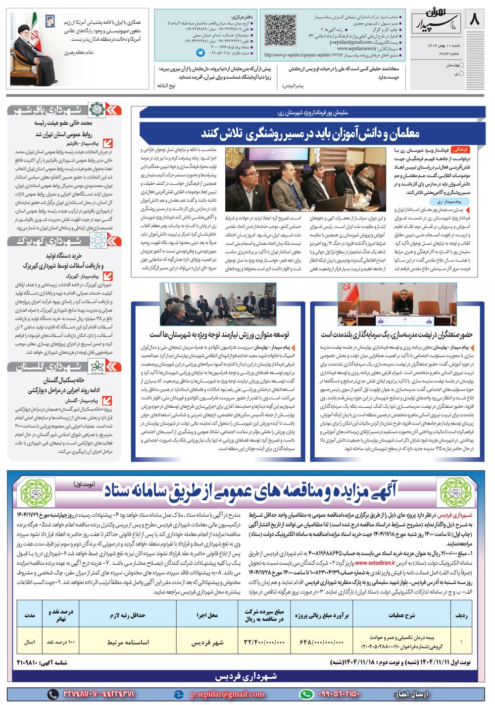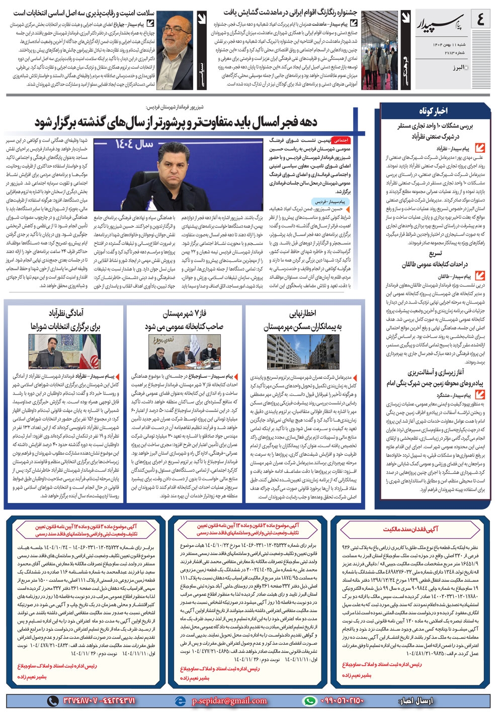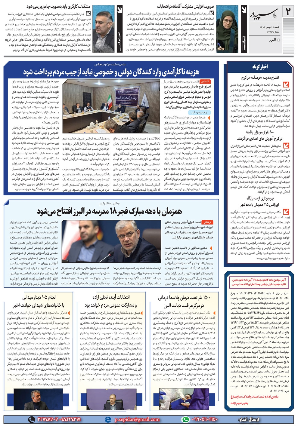 روزنامه پیام سپیدار شماره 2783 شنبه یازدهم دیماه سال هزارو چهارصدو چهار منتشر شد و در دسترس مخاطبین قرار گرفت. روزنامه پیام سپیدار را می توانید از کیوسک های مطبوعاتی سطح شهر تهیه کنید.