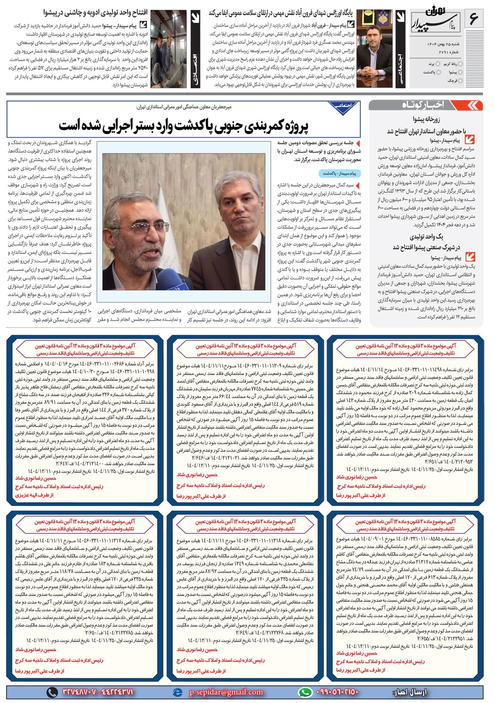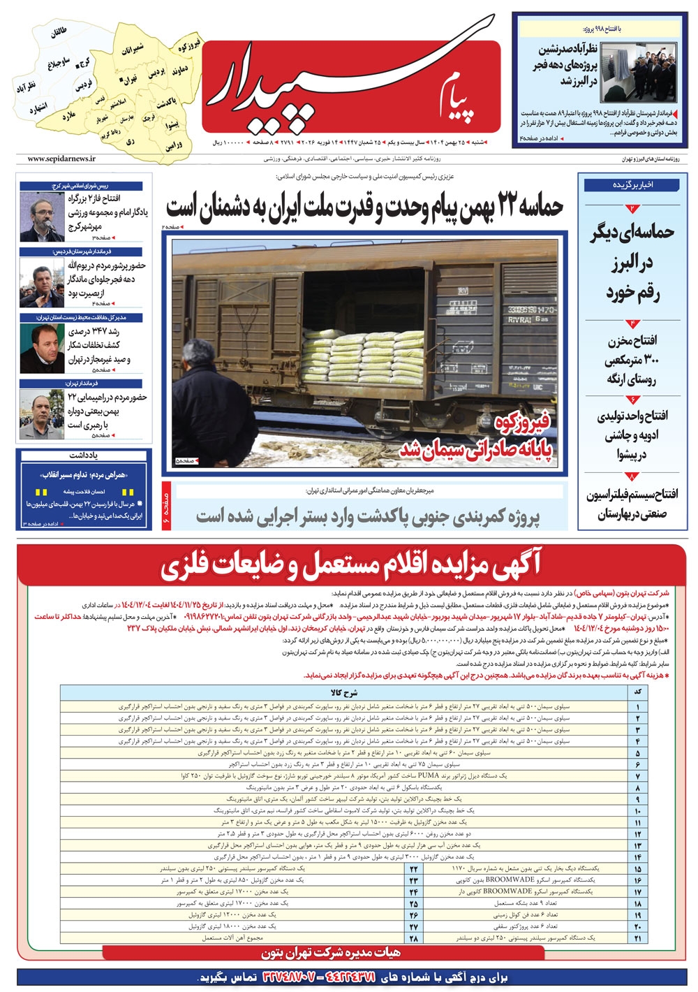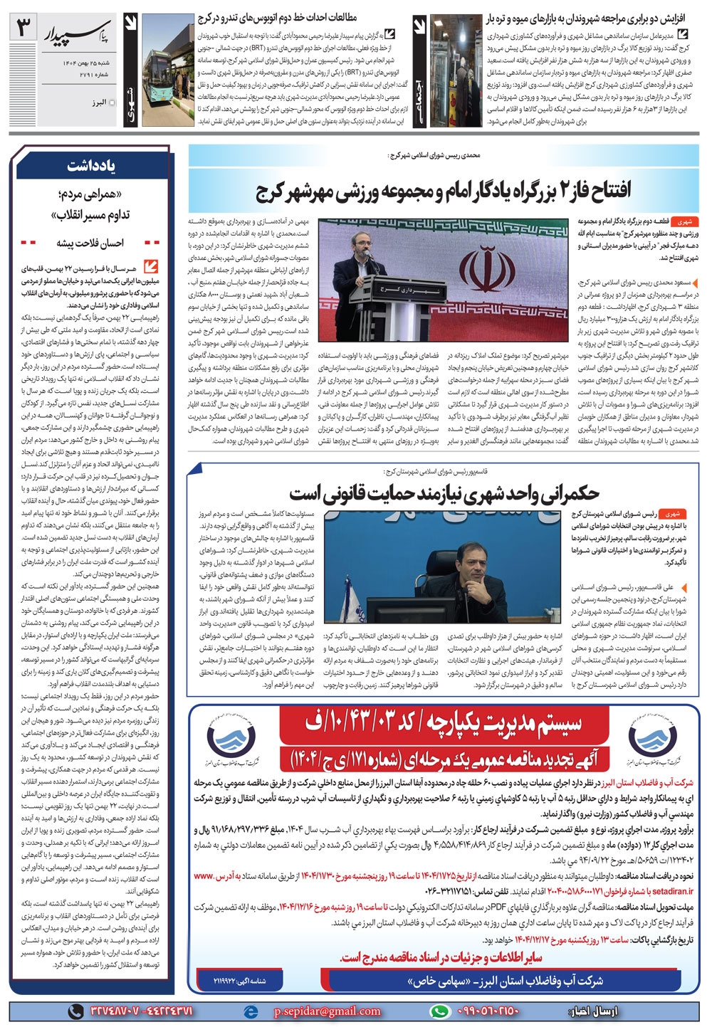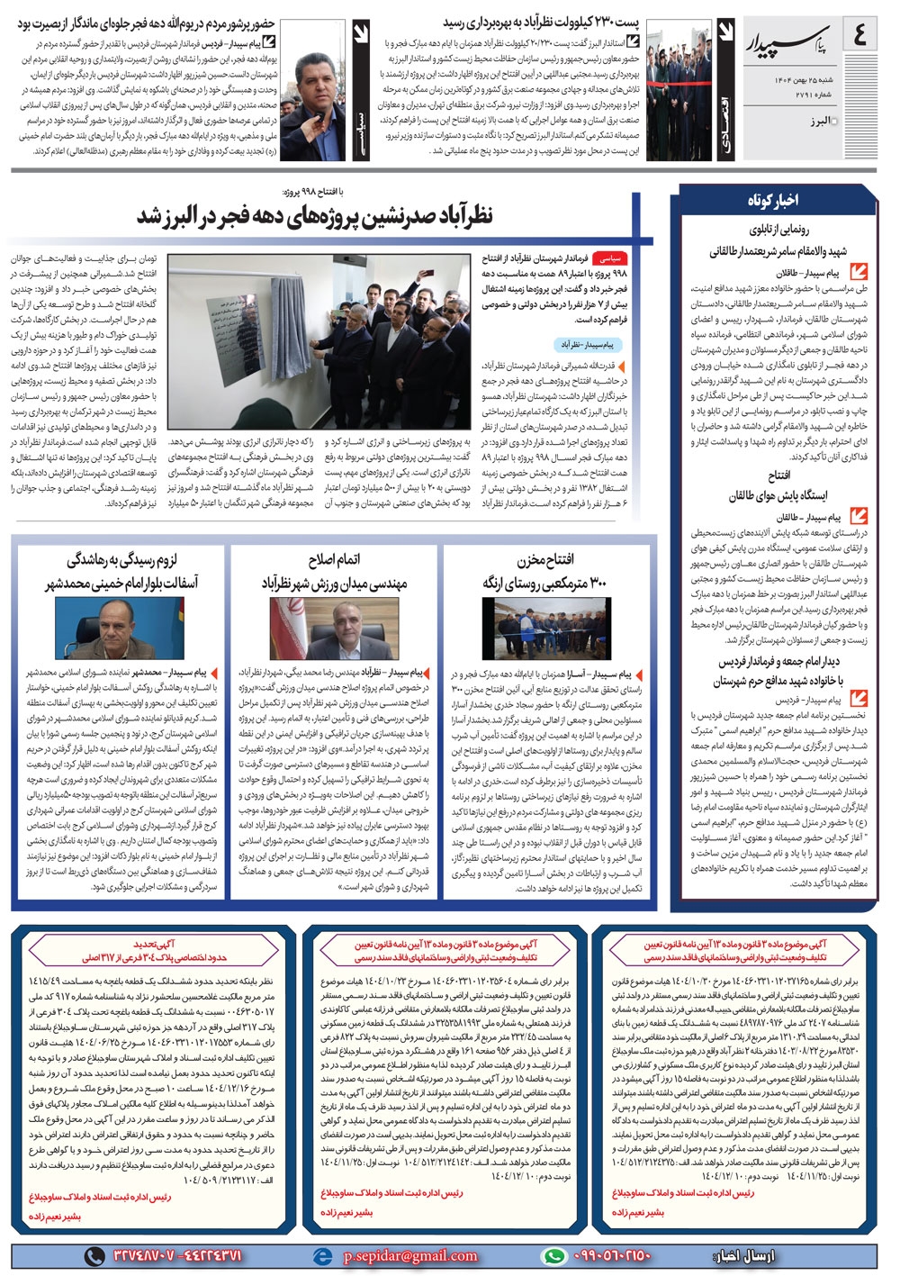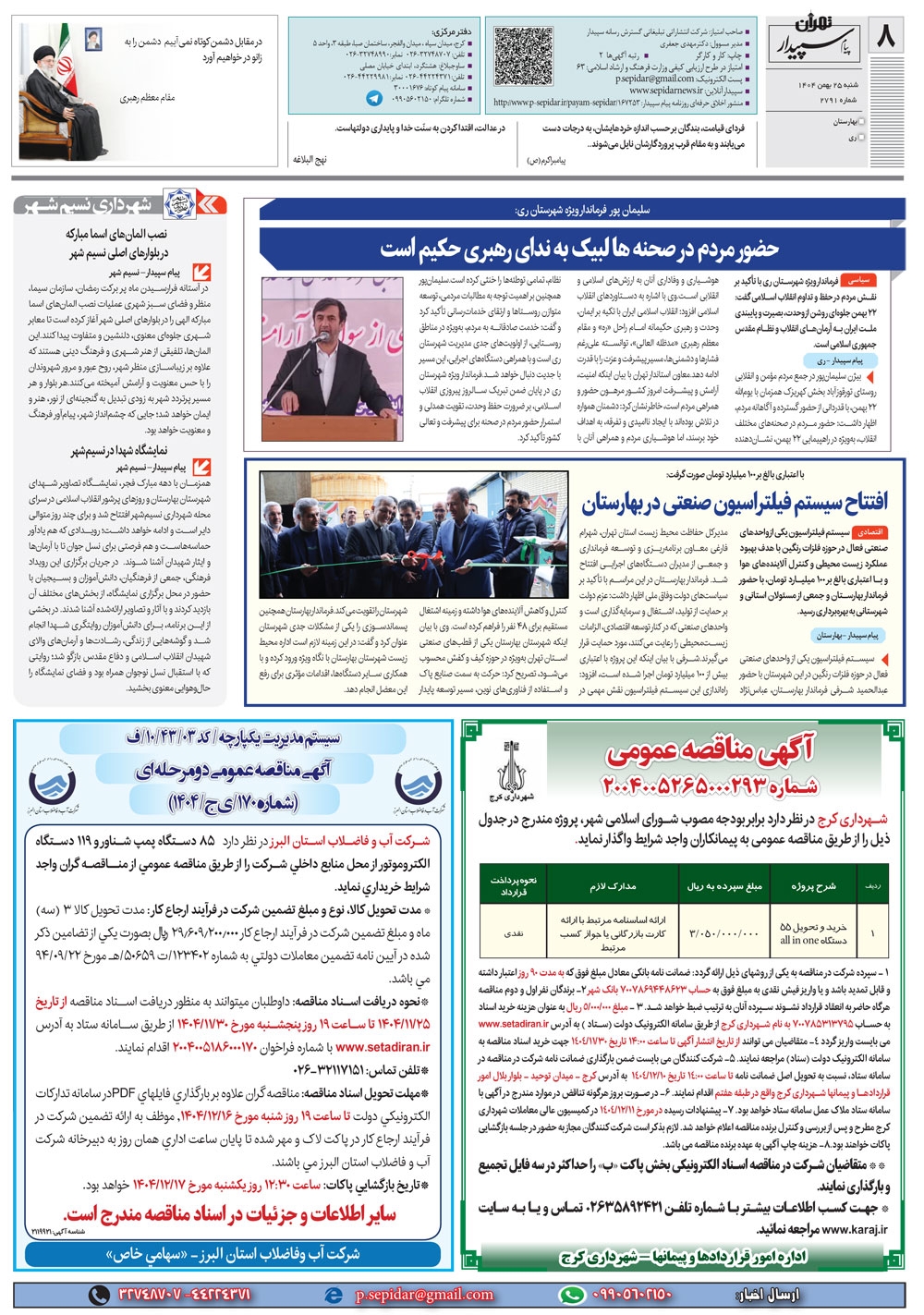 روزنامه پیام سپیدار شماره 2791 شنبه بیست و پنجم بهمن ماه سال هزارو چهارصدو چهار منتشر شد و در دسترس مخاطبین قرار گرفت. روزنامه پیام سپیدار را می توانید از کیوسک های مطبوعاتی سطح شهر تهیه کنید.