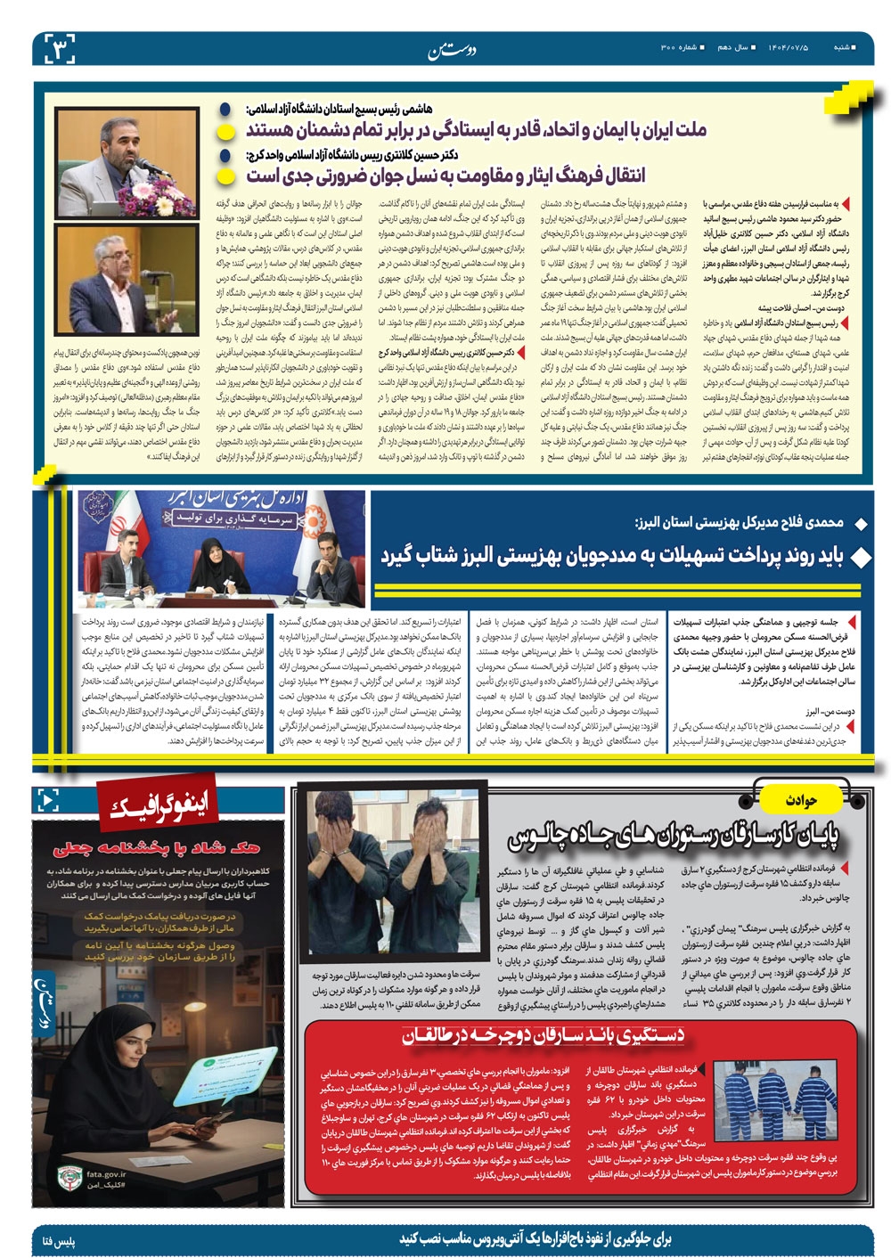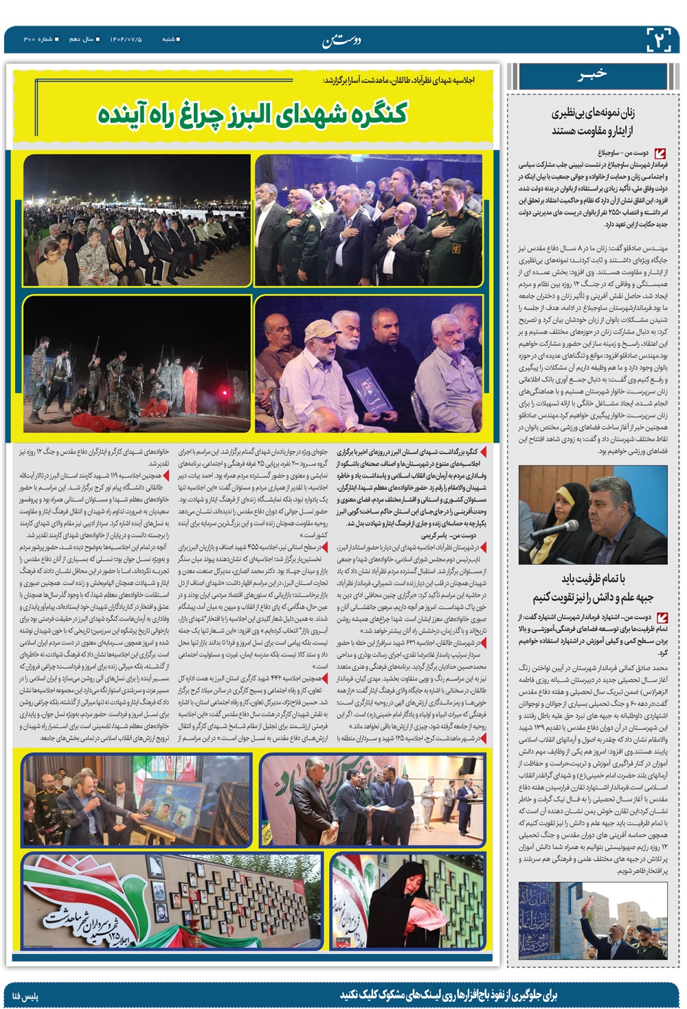 هفته نامه دوست من شماره 300 شنبه پنجم مهر ماه سال هزار و چهارصدو سه منتشر شد و در دسترس مخاطبین قرار گرفت. هفته نامه دوست من را می توانید از کیوسک های مطبوعاتی سطح شهر تهیه کنید.