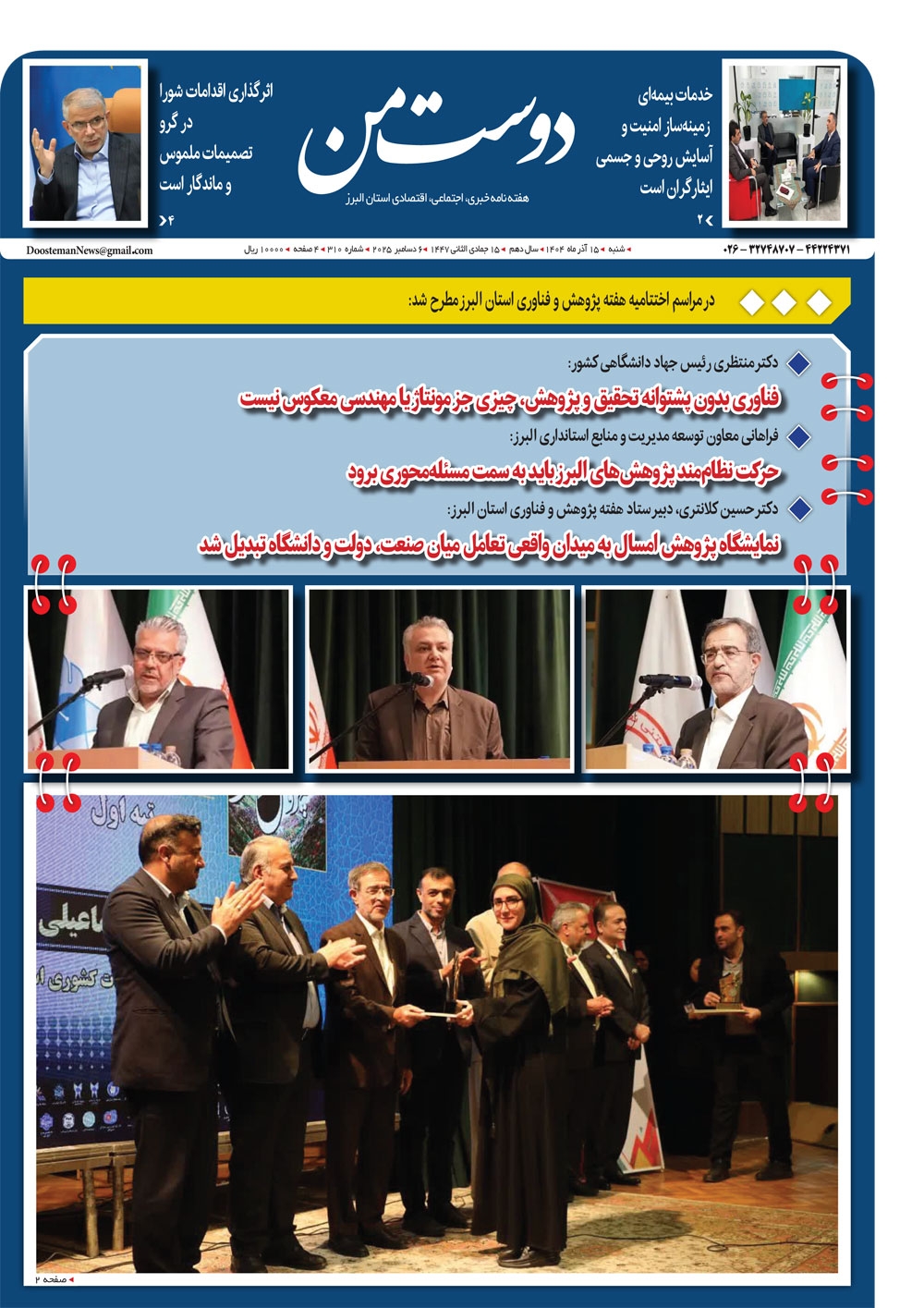 هفته نامه دوست من شماره 310 شنبه پانزدهم آذر ماه سال هزار و چهارصدو سه منتشر شد و در دسترس مخاطبین قرار گرفت. هفته نامه دوست من را می توانید از کیوسک های مطبوعاتی سطح شهر تهیه کنید.
