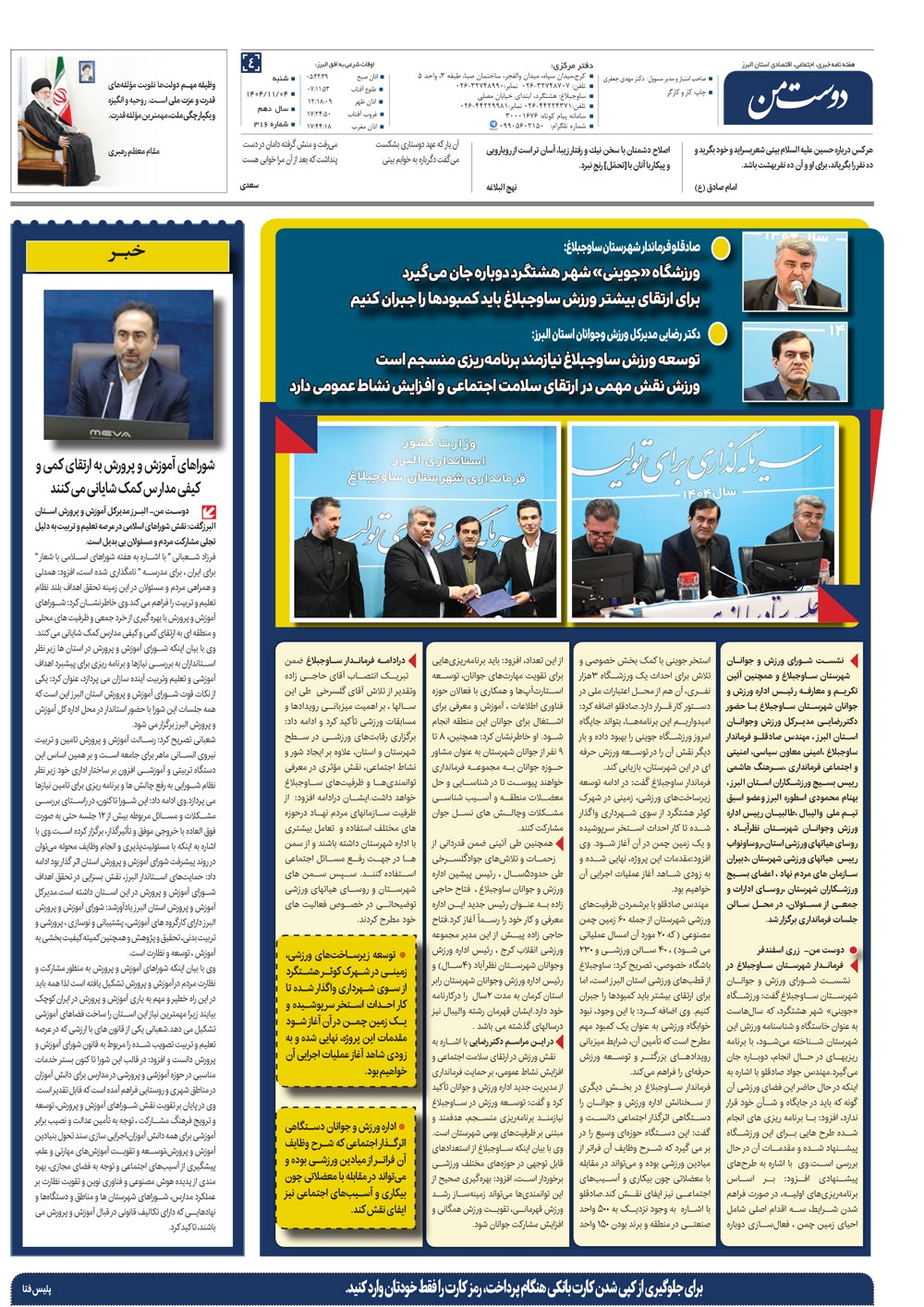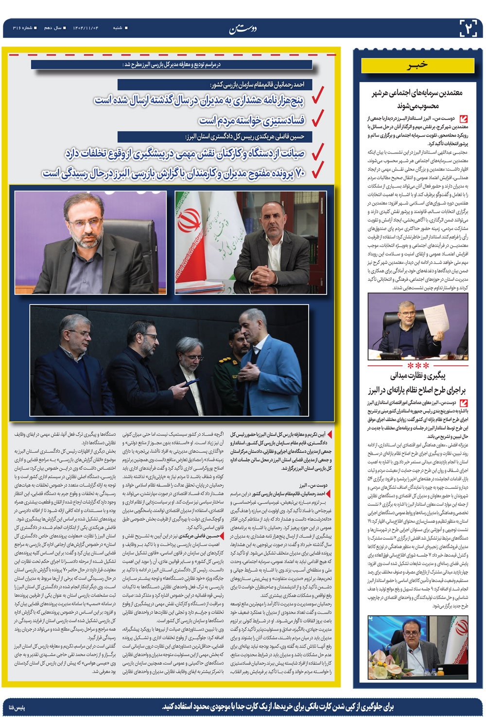 هفته نامه دوست من شماره 316 شنبه چهارم بهمن ماه سال هزار و چهارصدو سه منتشر شد و در دسترس مخاطبین قرار گرفت. هفته نامه دوست من را می توانید از کیوسک های مطبوعاتی سطح شهر تهیه کنید.