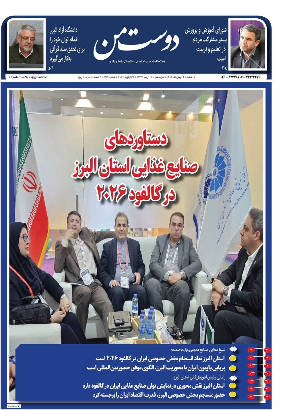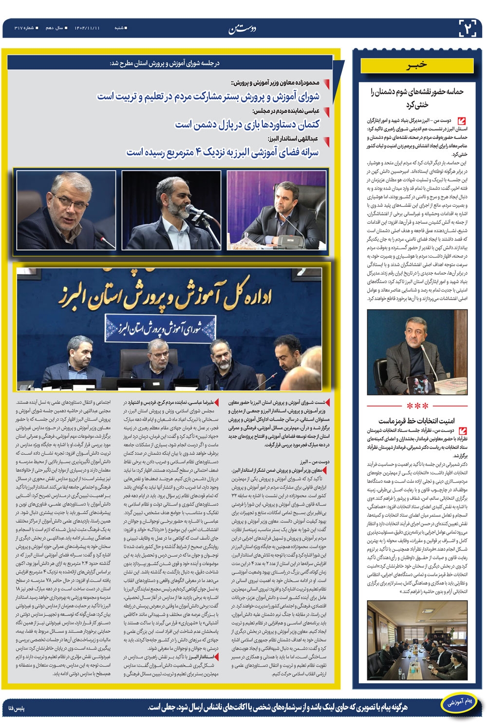 هفته نامه دوست من شماره 317 شنبه یازدهم بهمن ماه سال هزار و چهارصدو سه منتشر شد و در دسترس مخاطبین قرار گرفت. هفته نامه دوست من را می توانید از کیوسک های مطبوعاتی سطح شهر تهیه کنید.